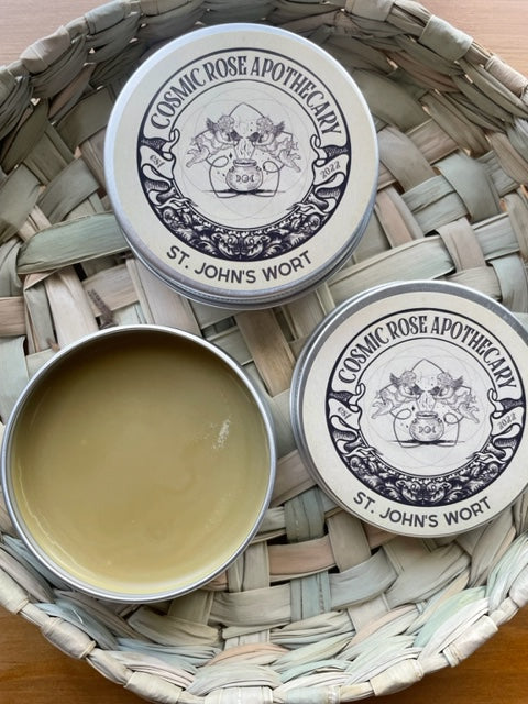 Ingredients: Organic St John's wort harvested on the summer solstice, organic extra virgin cold pressed olive oil, organic bees wax, and organic cocoa butter.